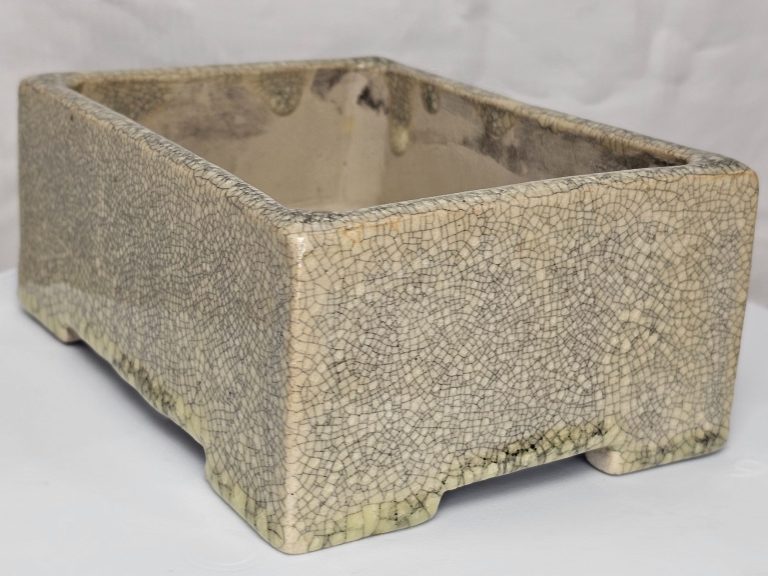 Maceta rectangular de líneas limpias y proporciones bajas, esmaltada en un tono claro con craquelado fino que recorre toda la superficie como una red sutil.
